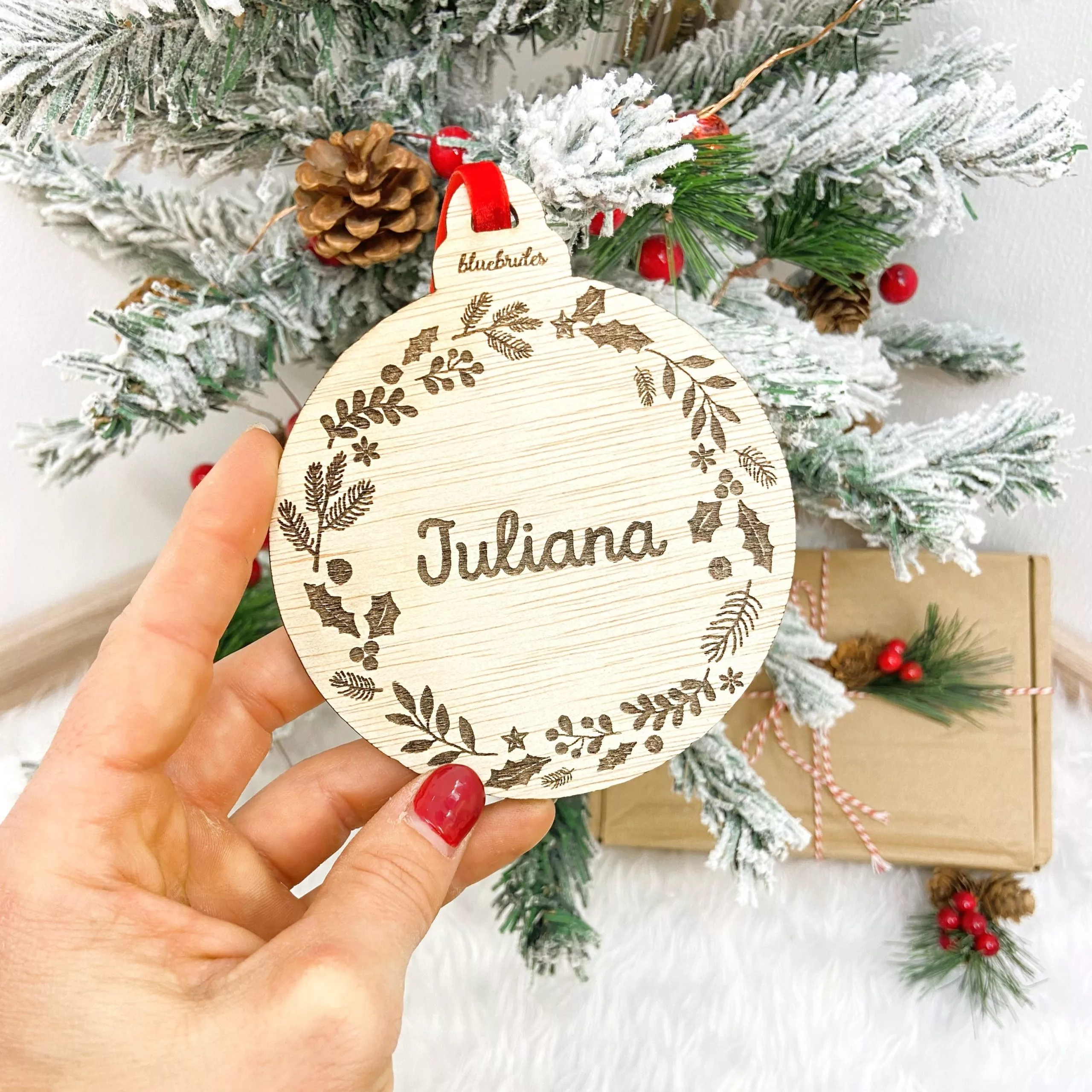 Este precioso adorno de madera, con forma circular de 10 cm de diámetro, está elaborado en madera Okume de 4 mm, lo que le da un acabado ligero, natural y muy elegante. Cada pieza se personaliza con el nombre, nombres o frase que elijas, convirtiéndola