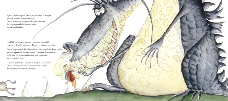 Después de un largo y profundo sueño un dragón hambriento reclama una princesa para satisfacer su hambre, pero como no hay princesas en esta aldea, deciden mandarle a un niño? Óscar debe ir a la cueva del dragón para ser devorado, pero Óscar es muy listo y además sabe cocinar, por lo que decide posponer el fatídico momento y ganarse al dragón por el estómago. Un divertido cuento sobre la astucia y la amistad.